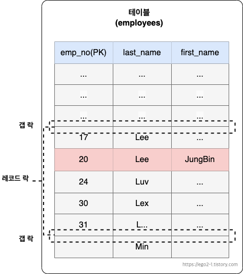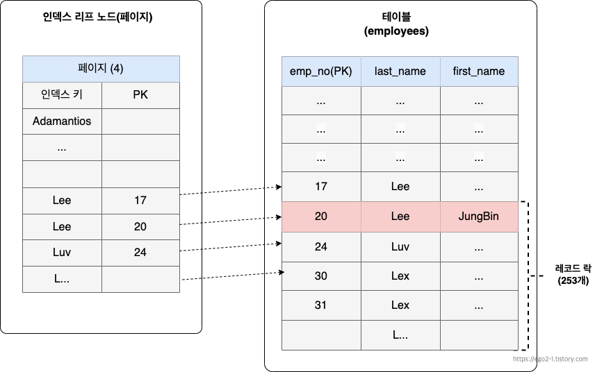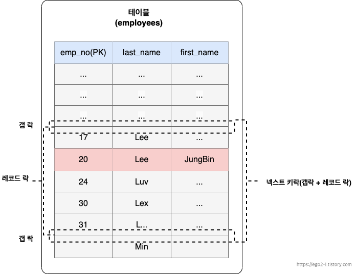 현재 last_name컬럼에만 인덱스가 걸려 있게 때문에 인덱스를 통해 last_name LIKE 'L%' 해당하는 모든 레코드에 잠금을 걸게 된다.