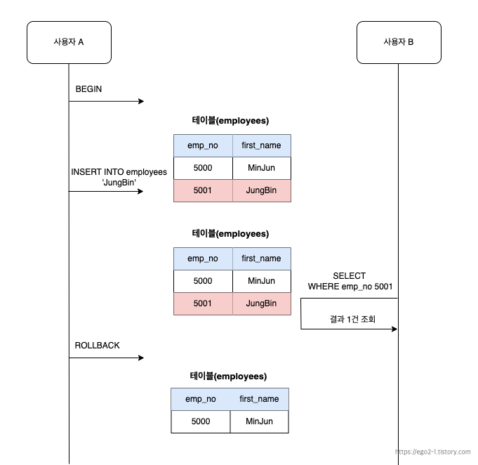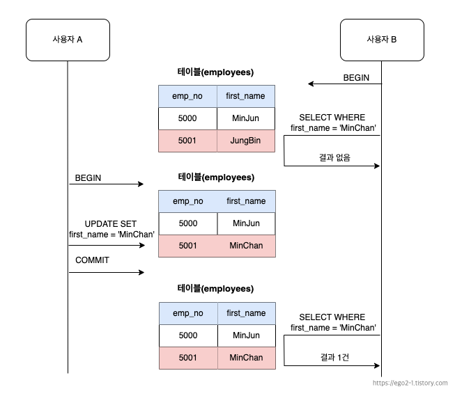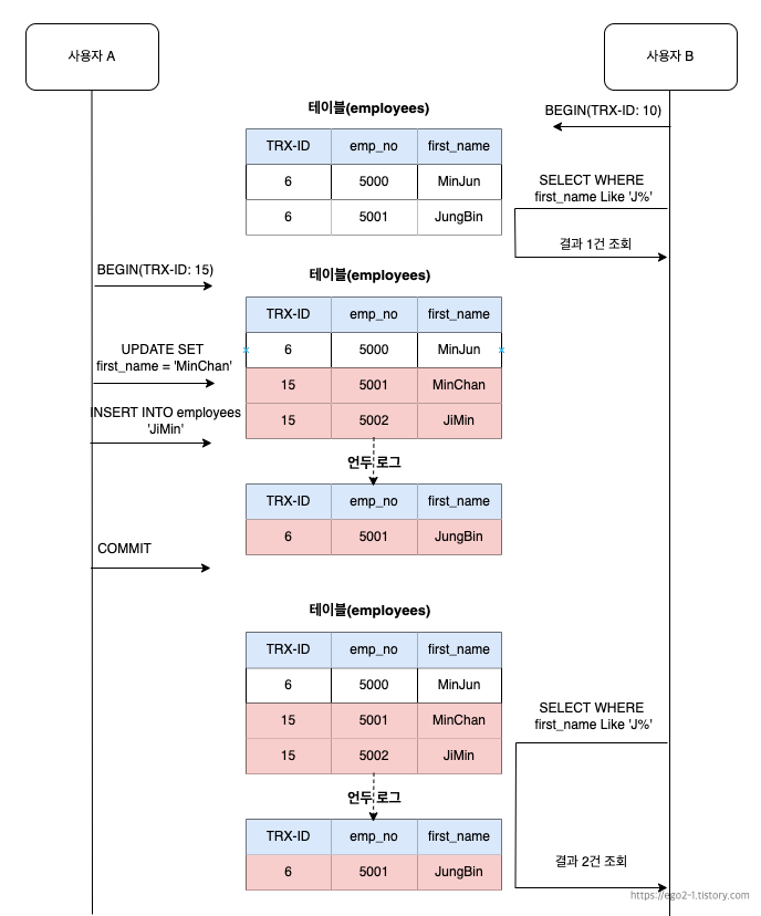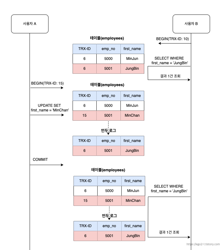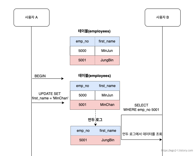 사용자 A 트랜잭션에서 emp_no 5001의 레코드의 first_name을 'MinChan'로 변경하고, 언두 영역에 백업한다. 그리고 first_name이 'JiMin'인 레코드를 새로 추가하고 커밋된다.