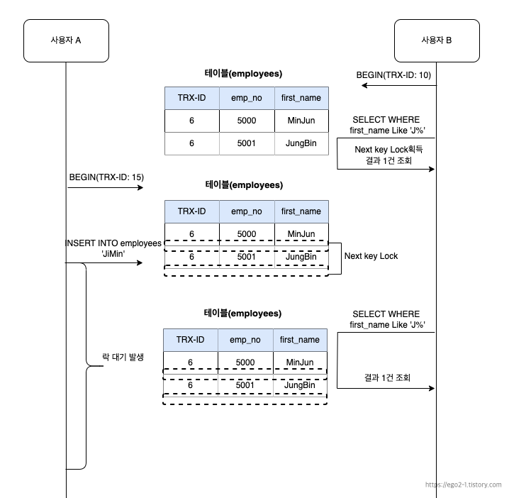 사용자 B 트랜잭션에서 first_name이 J%인 레코드를 검색한다. 이때 범위 검색이므로 레코드와 레코드 사이에 새로운 INSERT가 되는 것을 방지하기 위해 레코드락+갭 락인 넥스트 키 락을 적용한다. 사용자 A 트랜잭션에서 새로운 레코드로 JiMin을 추가하려하지만 락으로 인해 대기가 발생한다. 때문에 사용자 B 트랜잭션에서 다시 조회하여도 동일한 결과로 조회할 수 있어 팬텀리드가 방지된다.
