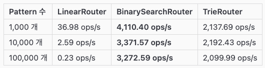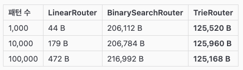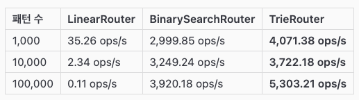 - 라우터에 등록된 패턴 수: 1,000 / 10,000 / 100,000개 순으로 비교