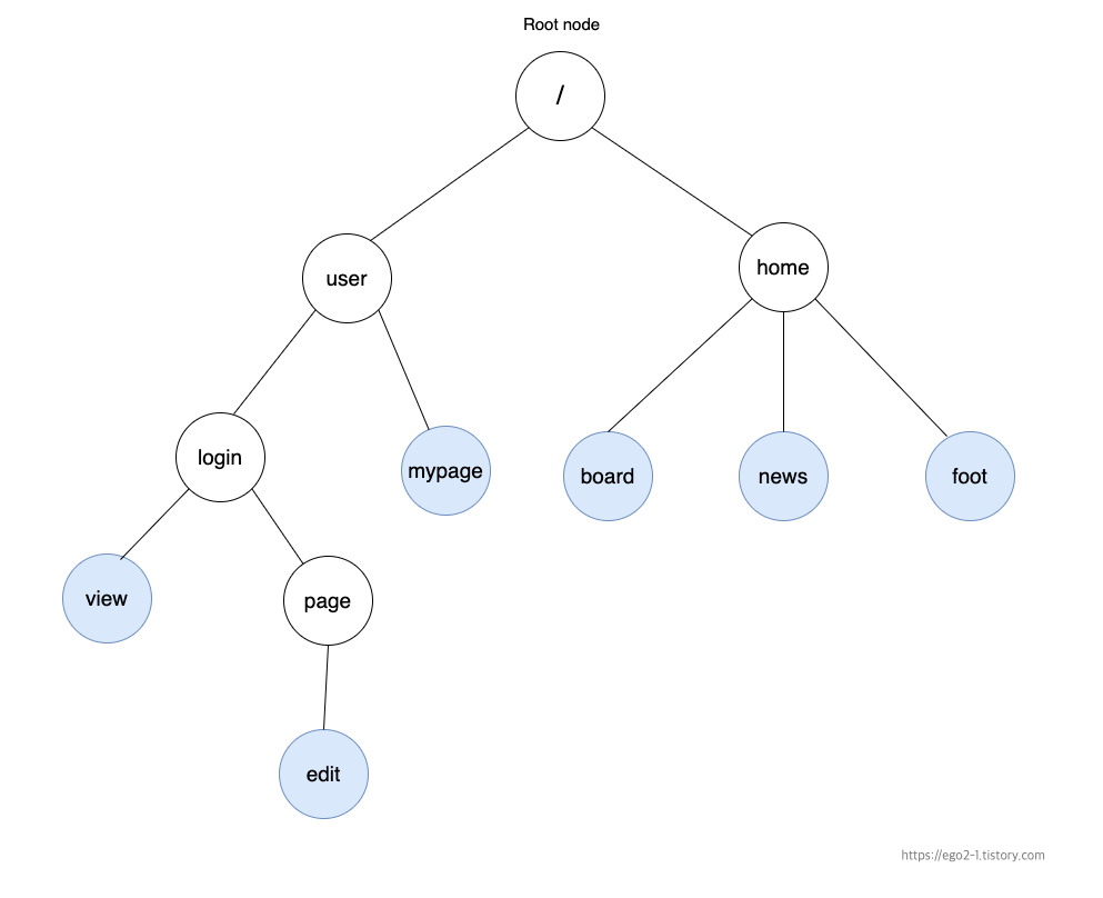 등록된 URL패턴이 아래와 같이 있다고한다면 "/"기준으로 하나의 노드로 구성한다.