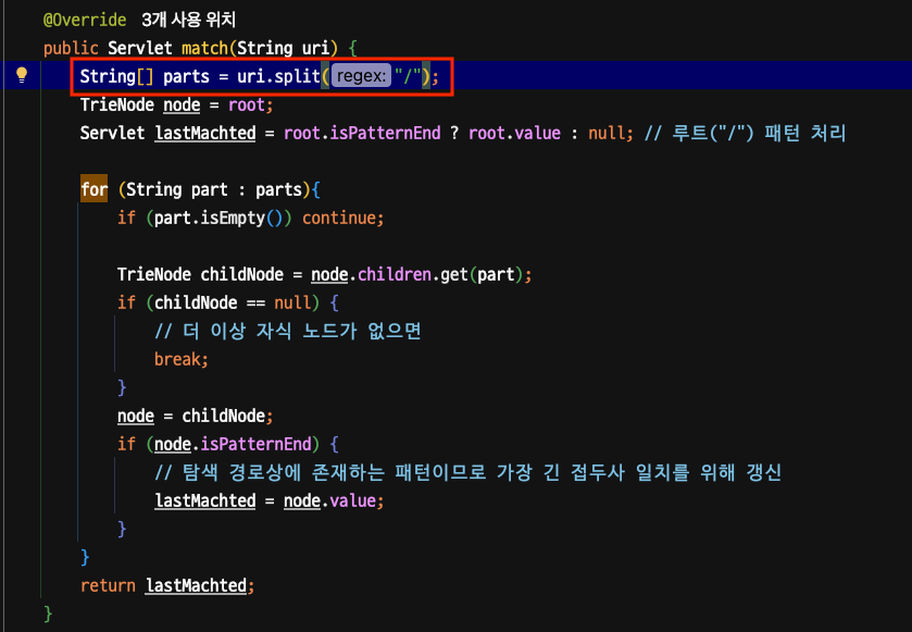 Java 컬렉션 API에 Trie가 없어, 직접 구현한 Trie 방식에 문제가 있을 것이라고 판단했다. match 메소드의 책임은 사용자에게 요청이 온 uri을 받아 가장 적합한 접두사 매칭된 서블릿을 반환하는 메소드이다.