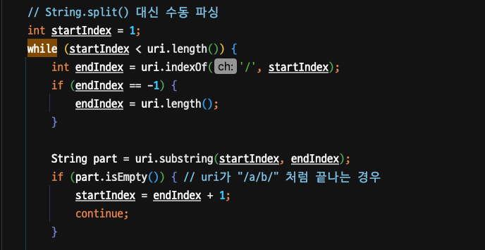URL파싱 부분의 String.split()이 매번 새로운 String 객체들과 String[] 배열을 힙메모리에 생성하기 때문에 URL가 길고 세그먼트가 많을수록 이 오버헤드가 커지는 않을까 가정을 하여 개선해보기로 하였다.
