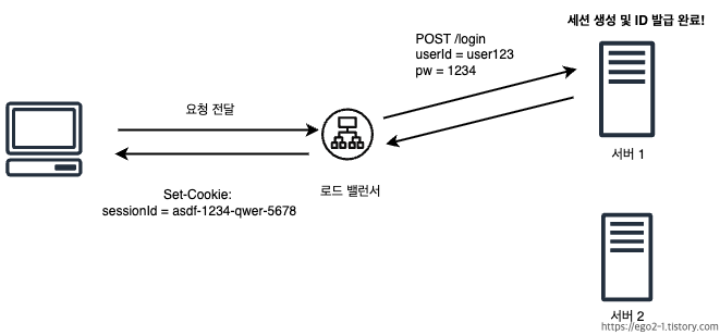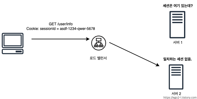 사용자가 서버1에 로그인하여 세션을 생성했다고 가정한다면, 서버1의 세션 저장소(메모리)에는 해당 사용자의 세션 정보가 저장된다. 하지만 사용자의 다음 요청이 로드 밸런서에 의해 서버2로 전달되게 된다면 문제가 발생한다.(로드 밸런서는 라운드 로빈으로 동작한다고 가정한다.)