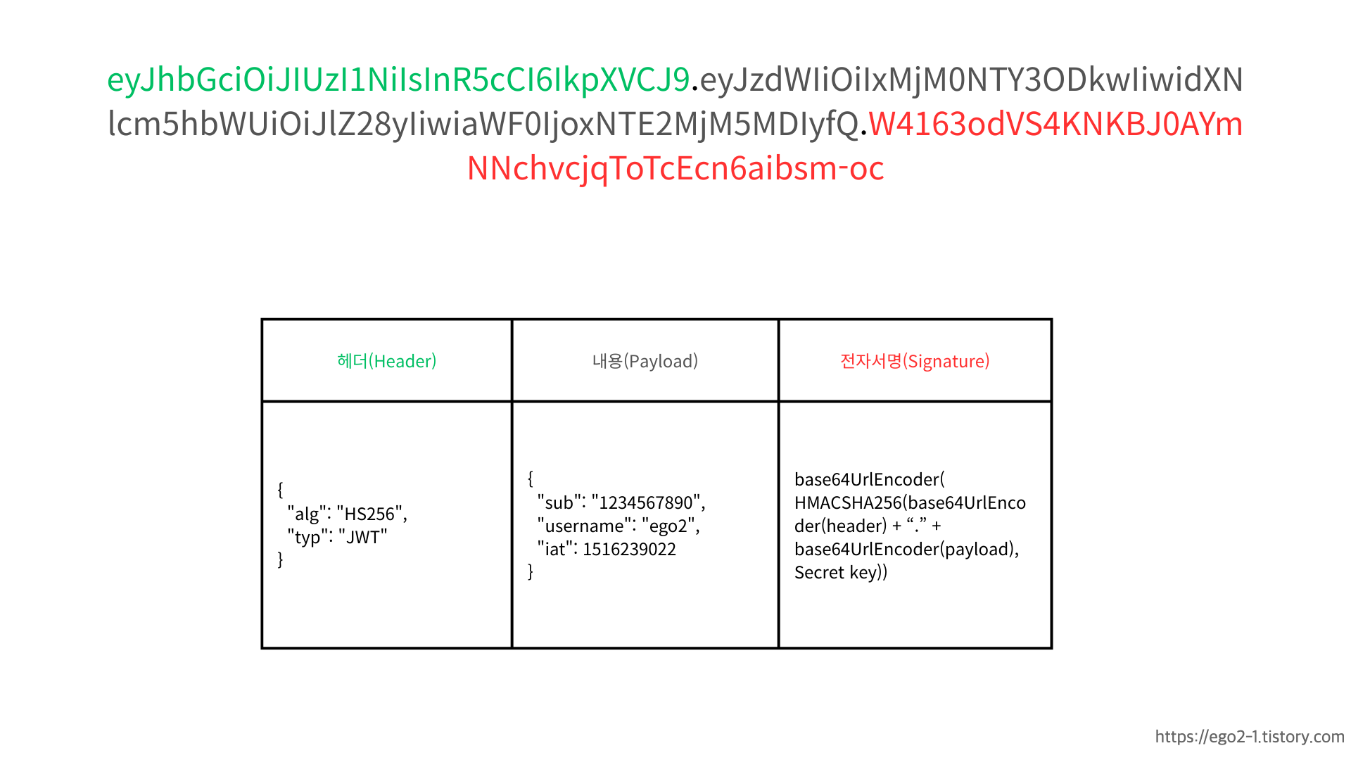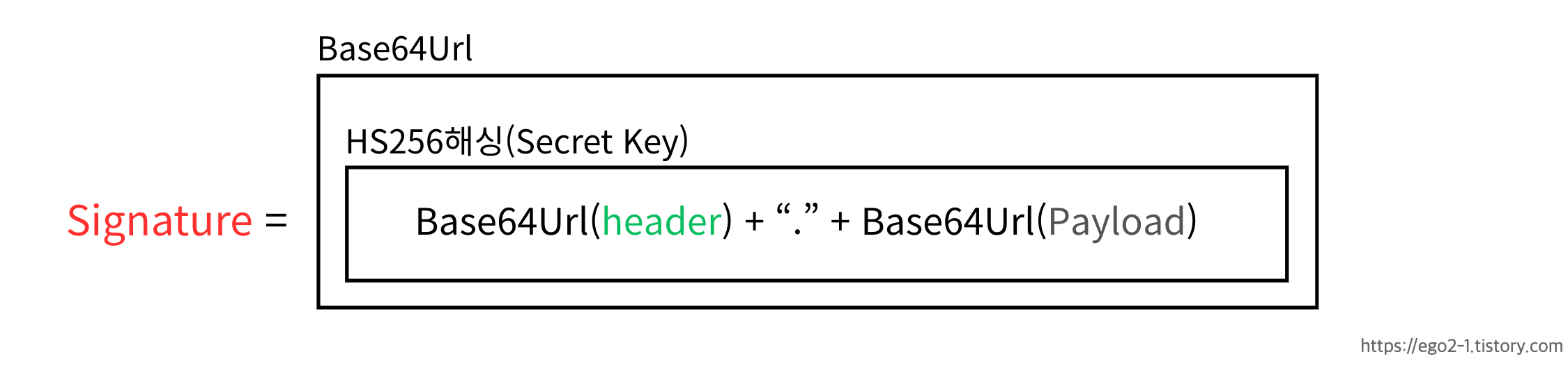 - Signature: 가장 중요한 부분으로, 인코딩된 Header와 Payload를 Base64 URL로 인코딩한 문자열을 서버만 아는 비밀키(Secret Key)로 해싱하여 Base64 URL로 다시 인코딩한 값이다. 이 서명을 통해 서버는 토큰이 위변조되지 않았음을 검증할 수 있다.
