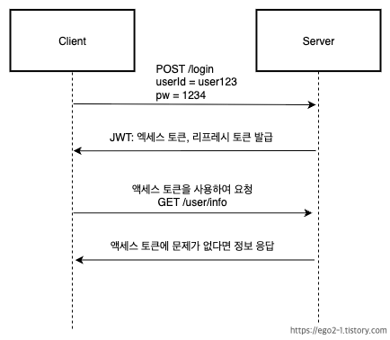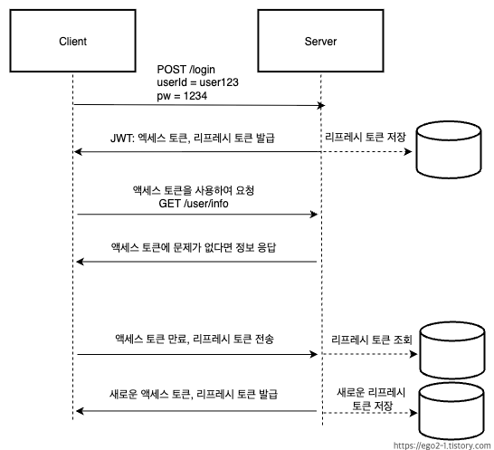 만약 공격자가 사용자의 토큰 자체를 탈취하여 요청을 보낸다면, 서버 입장에서는 정상적인 토큰이므로 인가된 사용자로 판단할 수 밖에 없다. 이러한 토큰 탈취 공격에 대응하기 위해 액세스 토큰(Acess Token)과 리프레시 토큰(Refresh Token)이라는 두 가지 종류의 토큰을 사용하는 전략이 고안된다.
