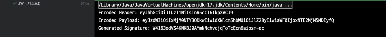 이제 실제로 주어지는 데이터로 생성한 JWT의 Signature값과, 위에서 설명한 과정을 코드로 구현했을 때의 결과가 정확히 일치하는지 테스트를 통해 확인해보자.