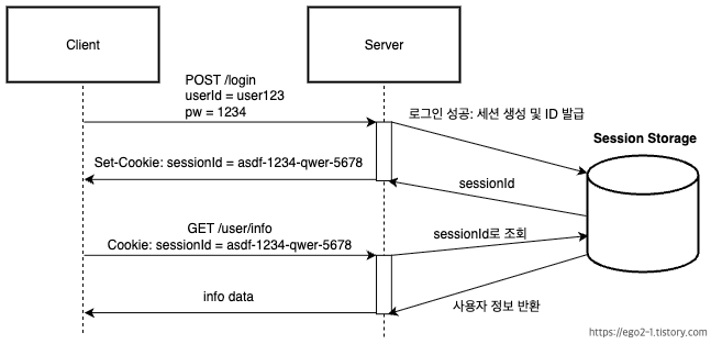 서버는 생성된 세션 ID를 Set-Cookie헤더를 통해 클라이언트에게 전달한다. 클라이언트는 이 세션 ID를 쿠키에 저장하고, 이후 /user/info와 같이 인증이 필요한 페이지에 접근할 경우 브라우저는 쿠키(세션 ID)를 요청 헤더에 자동으로 포함하여 서버에 전송한다.