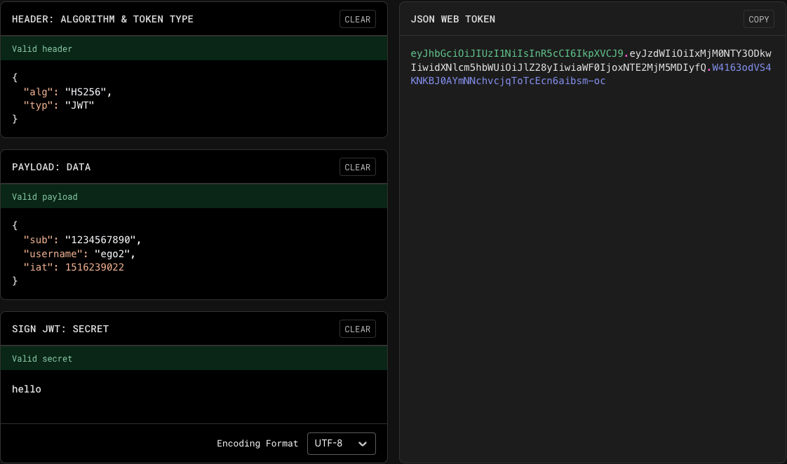 String payLoad = "{\"sub\":\"1234567890\",\"username\":\"ego2\",\"iat\":1516239022}";